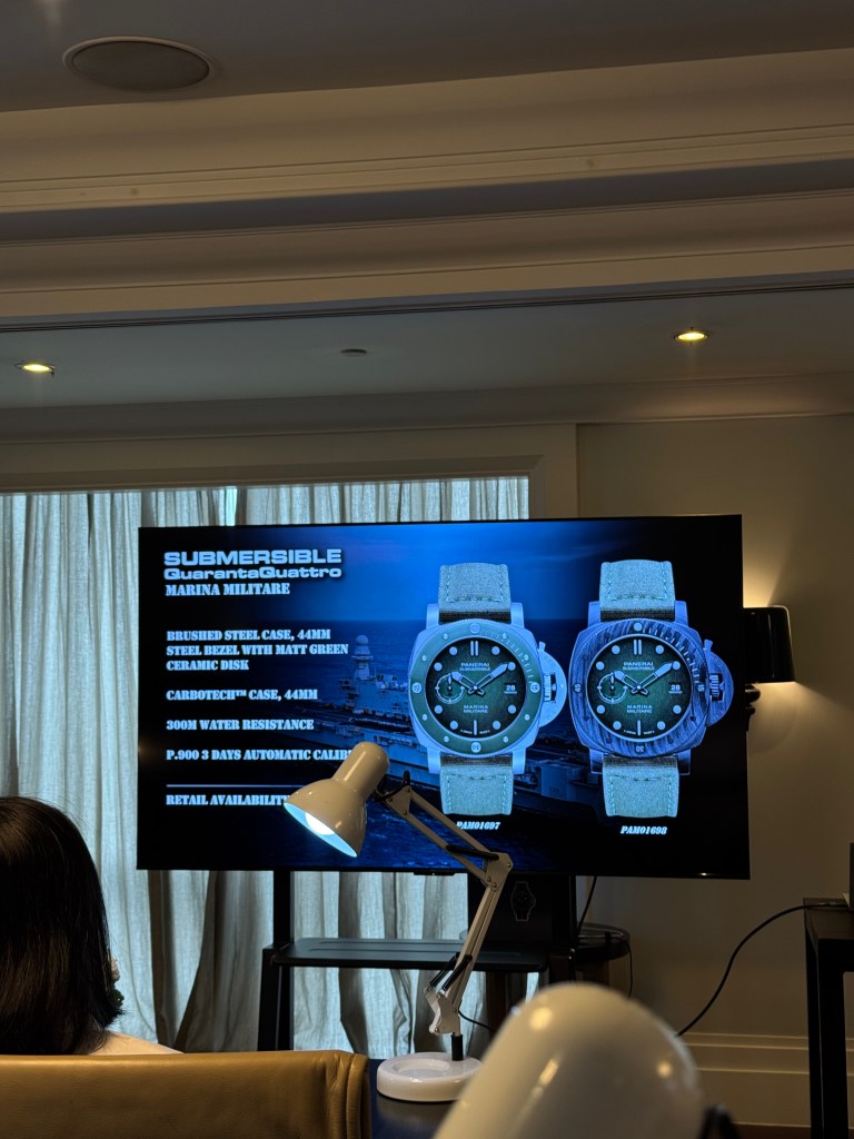Lesley Co, Managing Director for Panerai for Southeast Asia and Oceania, presented the Maison’s novelties for 2025. Panerai presented the low-key but highly complicated Luminor Perpetual Calendar GMT Platinumtech (PAM 01575). This watch features a GMT, a perpetual calendar (which can be set only via the crown without need for other pushers), and a power reserve indicator among others. The casebook has indicators for the month, year, and which sequence it is for the leap year. The Submersible Quaranta Quattro Marina Militare (PAM 1697 and 1698) featuring a steel case and a Carbotech case, respectively, were also standouts.